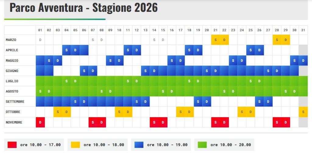 Quali sono i giorni e orari di apertura del Parco Avventura 2026?